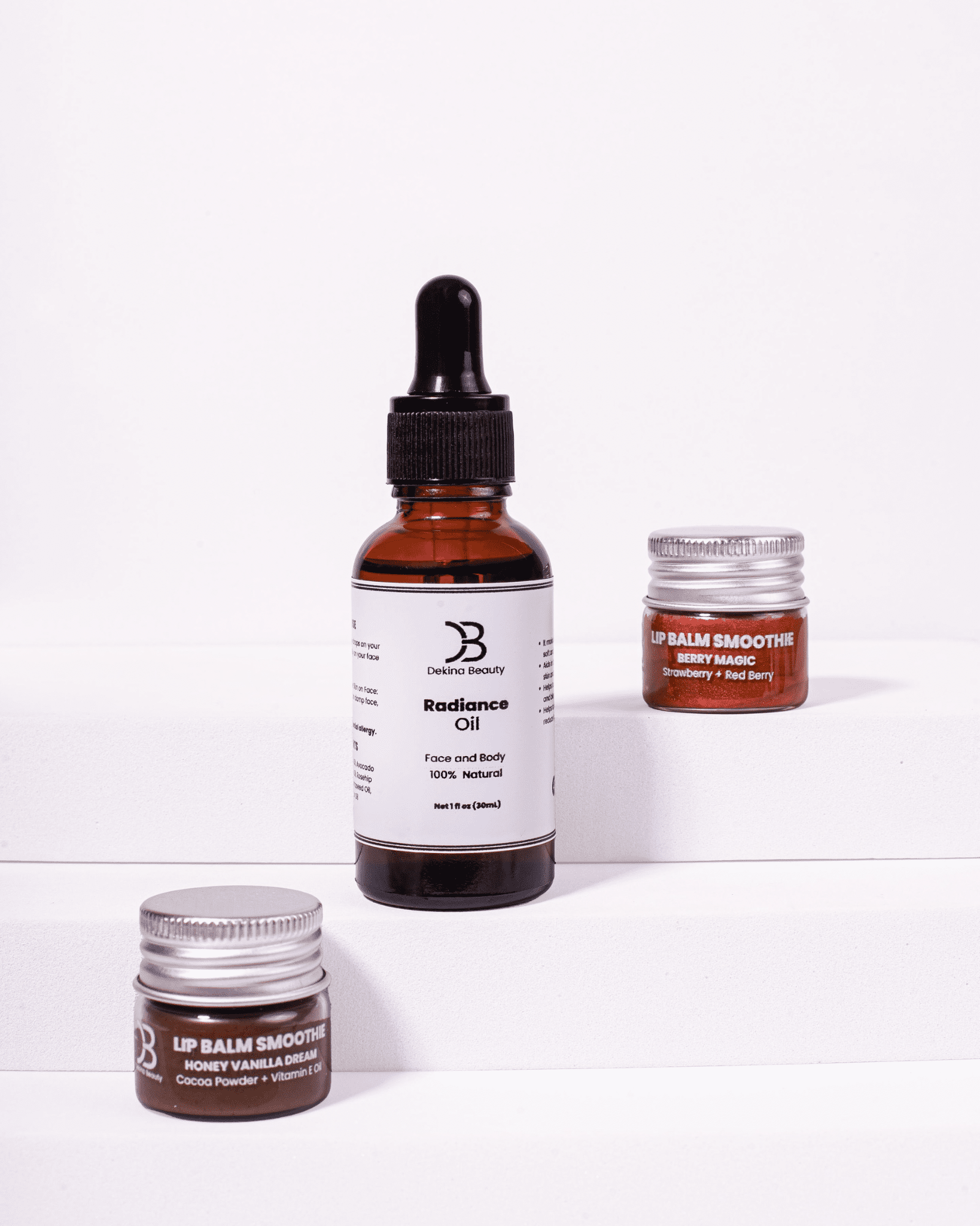 Experience the ultimate indulgence in skincare and lip care with our Radiance & Soft Lips Bundle. This luxurious trio includes our signature Radiance Oil, Berry Magic Lip Balm Smoothie, and Honey Vanilla Dream Lip Balm Smoothie. Each product offers unique benefits, ensuring your skin and lips are well-nourished, hydrated, and radiant.
