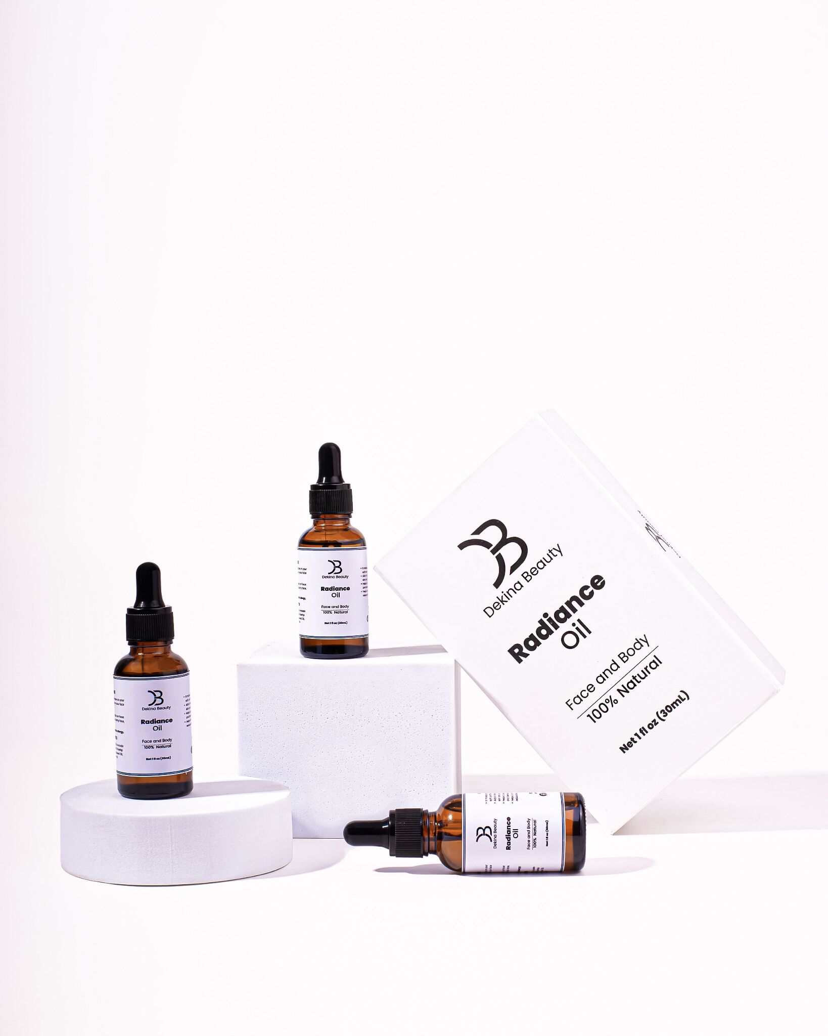 Dekina Beauty Radiance Oil is a luxurious skincare product designed to deeply hydrate, brighten, and nourish your skin. Packed with vitamins and antioxidants, this lightweight oil absorbs quickly, leaving your skin feeling soft, supple, and radiant. Perfect for enhancing your natural glow, Radiance Oil is a must-have for any skincare routine.