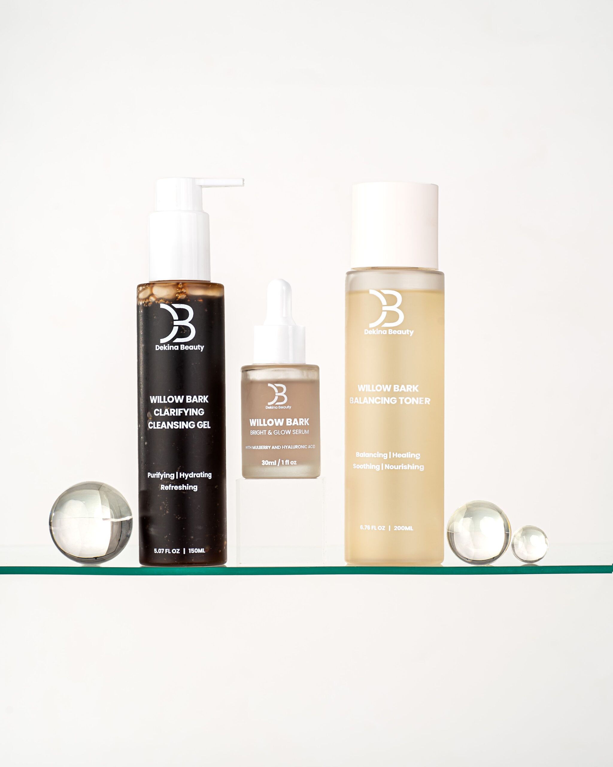 Step 3: Serum – Apply 2–3 drops of the Willow Bark Bright & Glow Serum and gently press into the skin until absorbed.